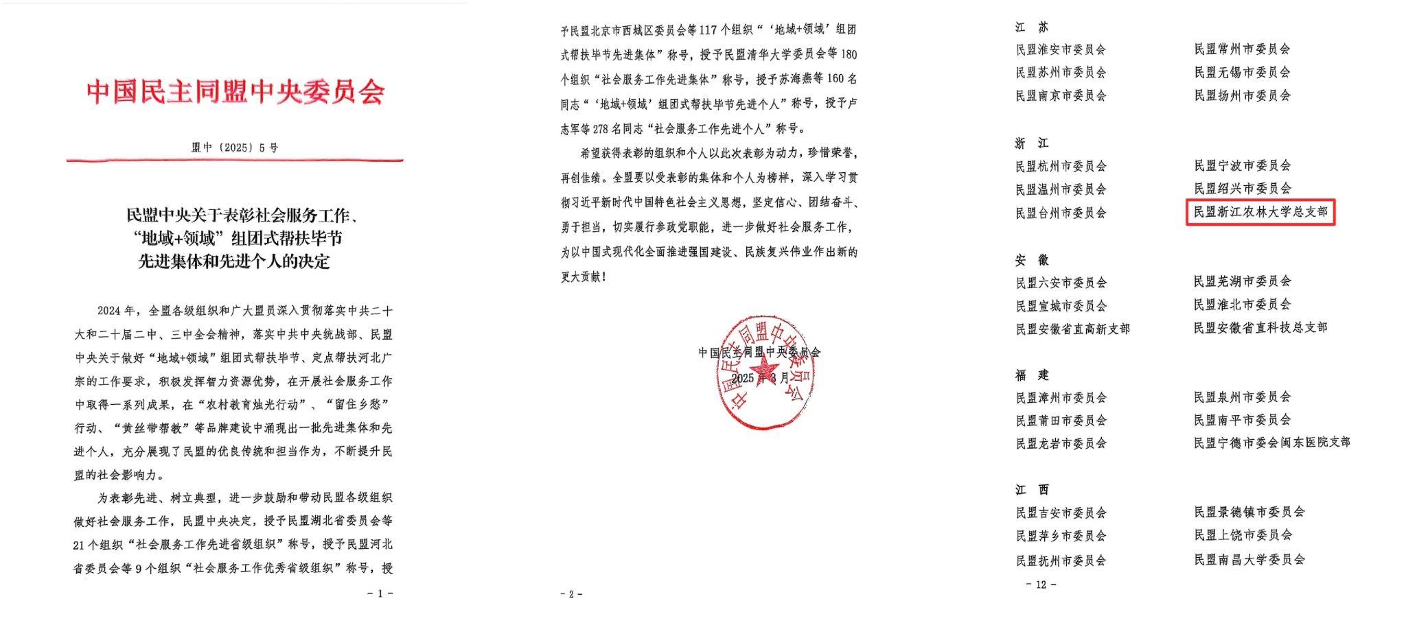 近日,民盟中央召開表彰會(huì)議,對社會(huì)服務(wù)工作、組團(tuán)式幫扶和定點(diǎn)幫扶工作中表現(xiàn)突出的集體與個(gè)人進(jìn)行表彰。民盟浙江農(nóng)林大學(xué)總支榮獲“社會(huì)服務(wù)工作先進(jìn)集體”稱號(hào),成為浙江省省屬高校中唯一獲此殊榮的基層組織,充分彰顯了其在服務(wù)社會(huì)、助力鄉(xiāng)村振興等方面所作出的重要貢獻(xiàn)。