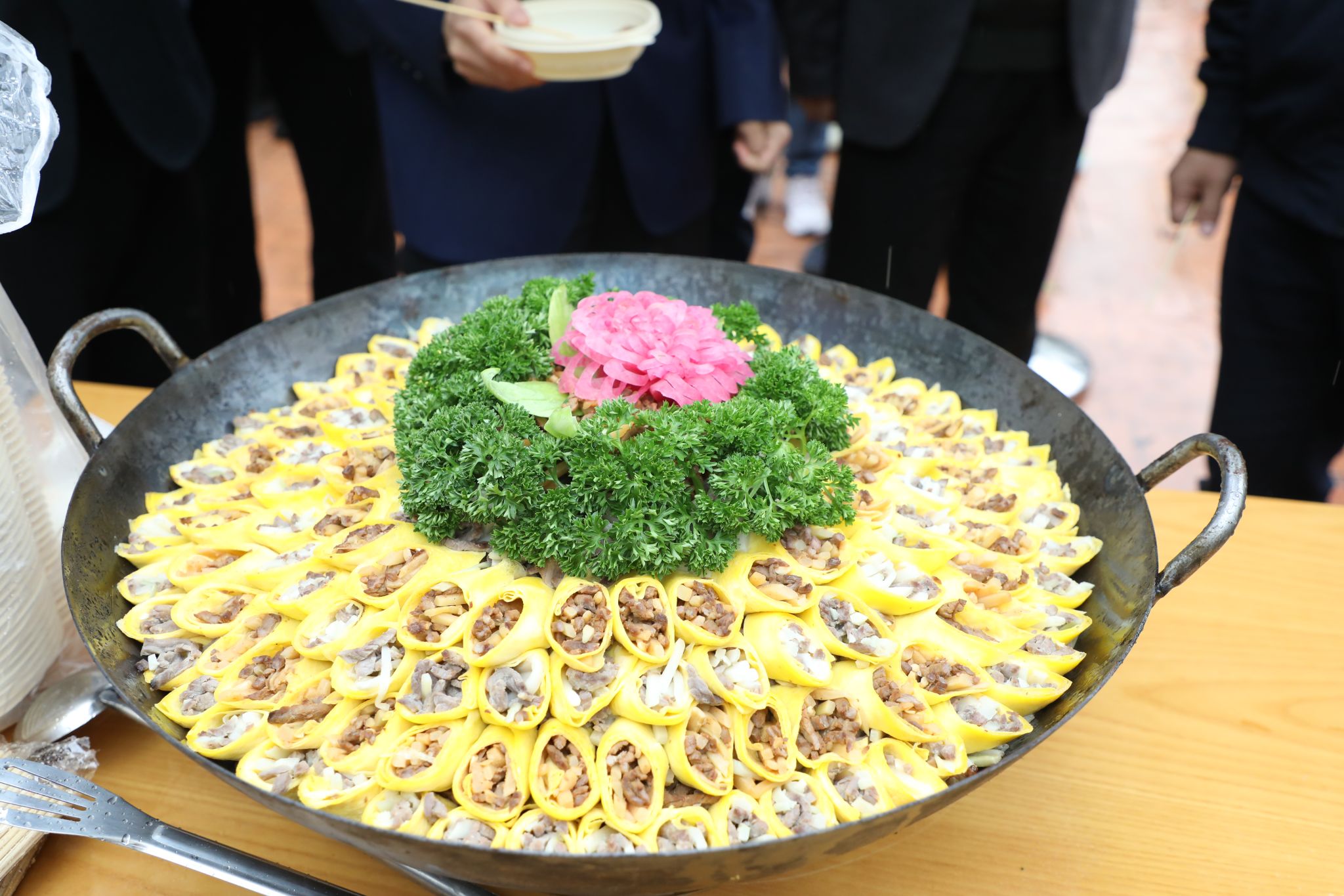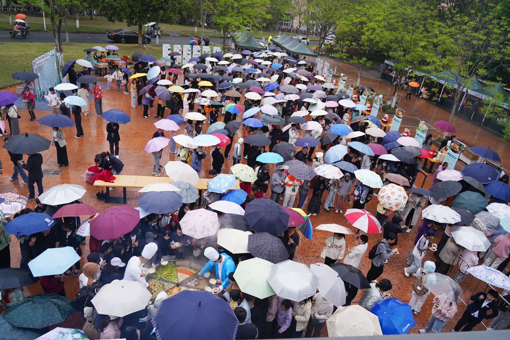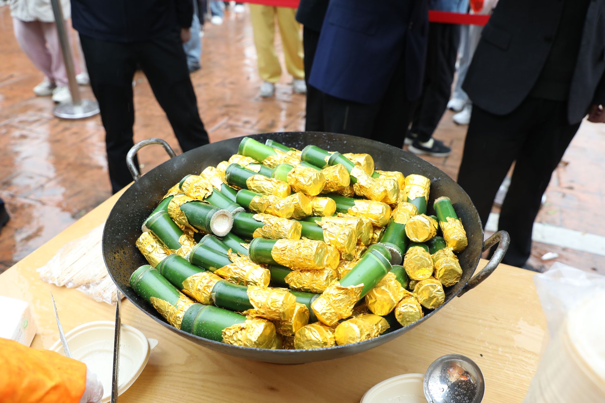 這是一口直徑達1.5米的超級大鐵鍋,鍋內是近千斤野筍、筍干、毛筍衣、雷筍、毛筍和各地竹筍烹飪而成的6道竹筍菜。隨著鍋蓋正式開啟,騰騰熱氣散發著濃郁的鮮香和春天的味道,引得排隊的師生垂涎欲滴。