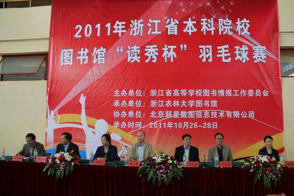 浙農林大新聞網訊 十月的浙農林大,秋高氣爽,碩果飄香。10月27日上午,由我校承辦的2011年浙江省本科院校圖書館“讀秀杯”羽毛球賽在我校籃球館羽毛球賽場拉開序幕。浙江省教育廳高教處副處長韓天琪,浙江農林大學副校長張立欽,浙江省高校圖工委副主任兼秘書長、浙江大學副館長章云蘭,浙江農林大學黨委委員、工會主席汪士華,浙江省高校圖工委副主任、浙江工業(yè)大學圖書館館長何立民,浙江省高校圖工委副主任、浙江大學副館長馬景娣,及來自全省26支代表隊的130余名運動員參加了開幕式。開幕式由圖書館館長、現(xiàn)代教育技術中心主任王長金主持。