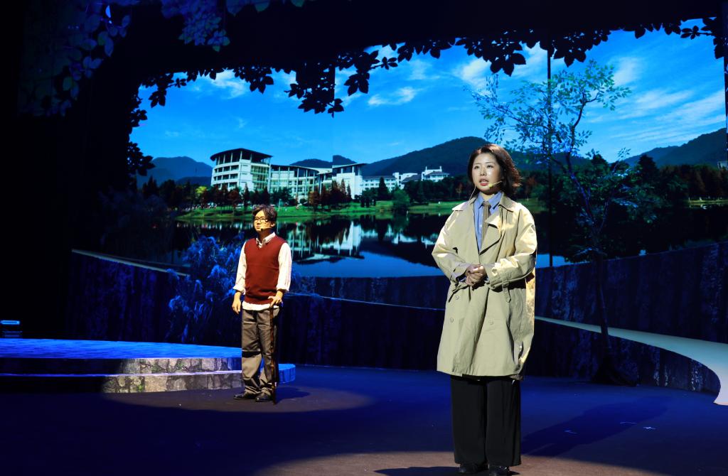 《大地戀歌》以“黨的好干部”楊東海校友,“浙江省優(yōu)秀共產(chǎn)黨員”“浙江省模范科技特派員”邵志鵬老師等為人物原型,以學(xué)校上世紀(jì)80年代以來,師生科技助力“兩山”理念發(fā)源地——安吉渾泥崗脫貧致富為故事原型,講述校友“孫大林”畢業(yè)后扎根農(nóng)村基層,一心服務(wù)“三農(nóng)”,教師“秦志鵬”犧牲在科技扶貧路上的感人故事;謳歌了一代代具有“肯干、實干、能干”品質(zhì)的浙農(nóng)林人,幾十年薪火相傳,“把荒山變青山、把青山變金山”的農(nóng)林故事。整場話劇情節(jié)跌宕起伏,高潮迭起,當(dāng)看到“秦志鵬”博士冒著大雨送香榧苗因公殉職后,他懷孕的妻子聲嘶力竭地呼喚他的名字時,現(xiàn)場許多觀眾熱淚盈眶。大幕落下,全體觀眾集體起立,向演員們的精彩演出報以經(jīng)久不息的掌聲。