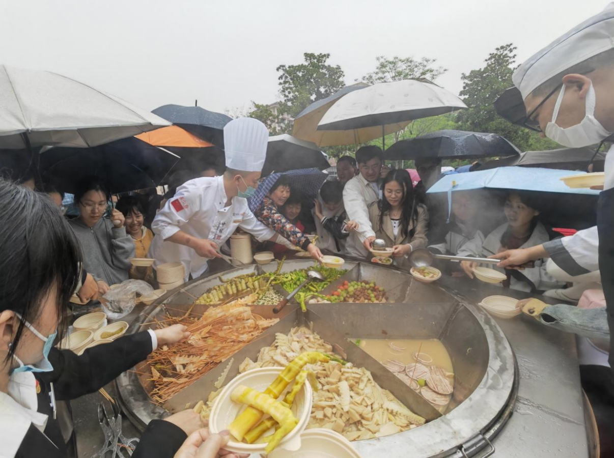 在浙江農(nóng)林大學(xué)東湖食堂廣場上,六種當(dāng)季鮮筍經(jīng)慢火煨燉,與金華火腿、舟山帶魚等12個地理標(biāo)志食材交融,形成“地標(biāo)十二鮮”特色宴席。活動現(xiàn)場同步開展剝筍競速、竹藝創(chuàng)作、非遺展示等30余項體驗活動。來自浙江省十余所高校的廚師團(tuán)隊現(xiàn)場烹制百道筍系菜肴,竹制餐具、生態(tài)鉛筆等創(chuàng)新成果首次集中亮相。