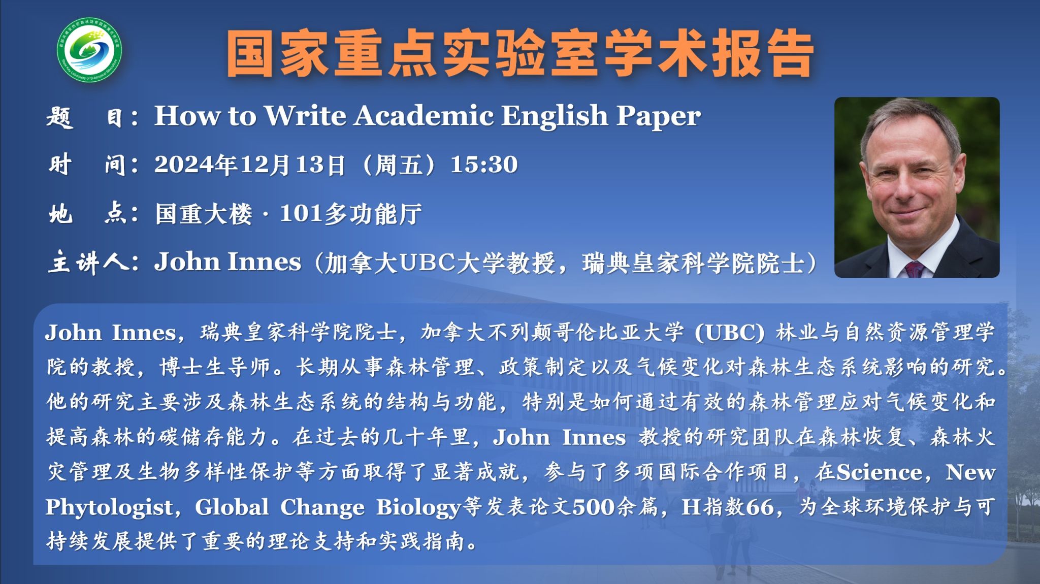 John Innes,瑞典皇家科學院院士,加拿大不列顛哥倫比亞大學 (UBC) 林業與自然資源管理學院的教授,博士生導師。長期從事森林管理、政策制定以及氣候變化對森林生態系統影響的研究。他的研究主要涉及森林生態系統的結構與功能,特別是如何通過有效的森林管理應對氣候變化和提高森林的碳儲存能力。在過去的幾十年里,John Innes 教授的研究團隊在森林恢復、森林火災管理及生物多樣性保護等方面取得了顯著成就,參與了多項國際合作項目,在《Science》、《New Phytologist》、《Global Change Biology》等發表論文500余篇,谷歌H指數66,為全球環境保護與可持續發展提供了重要的理論支持和實踐指南。