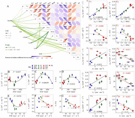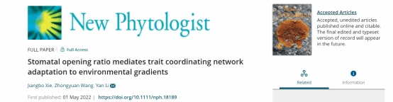 近日,國家重點實驗室森林生態學團隊(李彥教授團隊)以長文形式在New Phytologist(IF = 10.151)發表題為“Stomatal opening ratio mediates trait coordinating network adaptation to environmental gradients”的研究論文。該研究系統闡述了樹木末端器官(枝條和葉片)功能性狀(光合、氣孔解剖、氣孔功能、葉經濟譜和水分相關性狀)沿降水梯度帶區域分異規律,以及由功能性狀相互作用構成的協作網絡沿降水梯度帶的變異規律,結果發現氣孔打開比例(gratio)介導了性狀網絡對環境梯度的適應性(類似于相互關聯的性狀選舉出一個中心性狀——氣孔打開比例——居中調控整個網絡響應環境變化)。