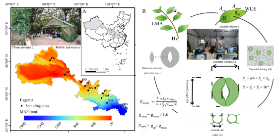 性狀協作網絡是由相互關聯的功能性狀構建而成,能夠反映基于性狀的適應策略。然而,對協作網絡跨空間尺度的變化特征,以及哪些驅動因素和機制調節了這種變化仍然不清楚。本研究以廣布種——西伯利亞榆樹(Ulmus pumila)為研究對象,沿中國東南濕潤區(潮濕森林)到西北干旱區(干旱荒漠)設置3800公里的研究樣帶(該樣帶垂直于降水梯度;Fig. 1A),通過將光合、氣孔解剖、氣孔功能、葉經濟譜和水分相關性狀整合為一個協作網絡(Fig. 1B),填補了上述研究空白。