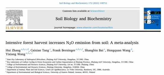 近日,國家重點實驗室森林碳匯研究團隊(王懿祥教授課題組)以“Intensive forest harvest increases N2O emission from soil: A meta-analysis”為題,在國際權威學術期刊《Soil Biology and Biochemistry》(中科院1區TOP,IF=7.609)在線發表研究論文,用Meta分析方法,系統研究了森林采伐這一重要森林經營措施對土壤N2O通量的影響,得出了重度采伐導致土壤N2O排放增加的科學結論。