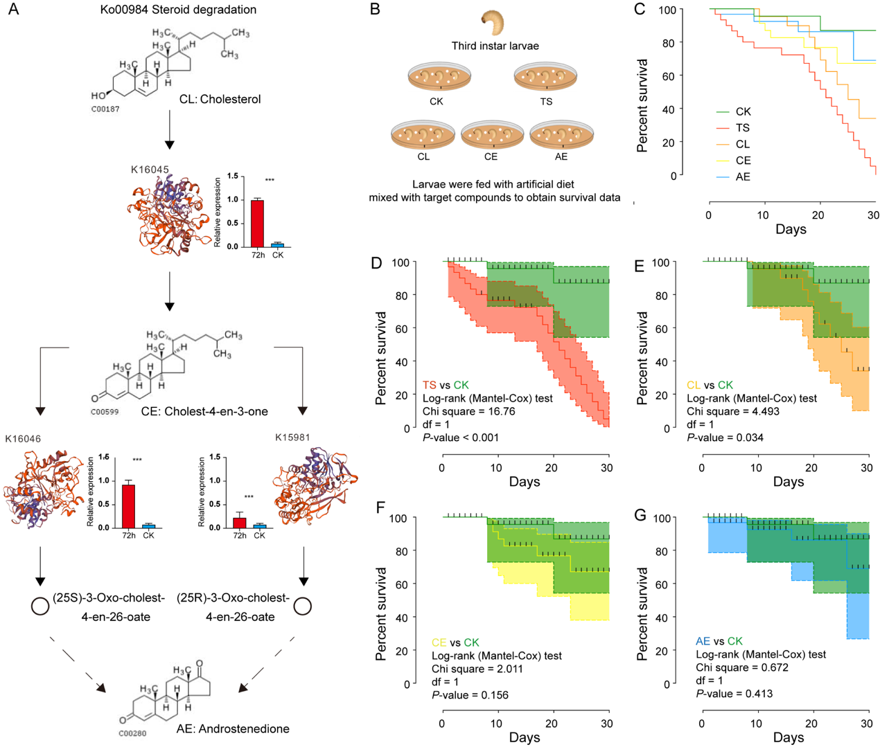 本研究選取為害油茶的專食性昆蟲茶籽象(Curculio chinensis)和其腸道分離的不動桿菌(Acinetobactersp. AS23)開展了一系列研究。研究發現三萜類皂苷化合物茶皂素是油茶的主要抗蟲物質,且不動桿菌屬與茶皂素含量明顯相關。分離培養得到的AS23屬于不動桿菌的Acb分支,基因組與耐藥不動桿菌鮑曼(Acinetobacter baumannii)有良好的共線性,并注釋到59個耐藥性相關基因和47個與萜類降解有關的基因。多抗生素耐藥性研究發現,除新霉素和慶大霉素,AS23對多種抗生素均具有耐藥性。使用AS23敏感的抗生素慶大霉素構建轉GFP熒光蛋白菌株,后續回接驗證發現飼料中添加AS23菌株可以顯著提高茶籽象的存活率。不同時段茶皂素降解的單菌原核轉錄組結果及qPCR驗證分析,認為Ko00984(Steroid degradation)通路的3個關鍵基因可能參與了茶皂素降解。通過對Ko00984通路相關化合物對茶籽象幼蟲的毒性研究,進一步證實類甾體降解通路可能是AS23菌株降解茶皂素的關鍵途徑。