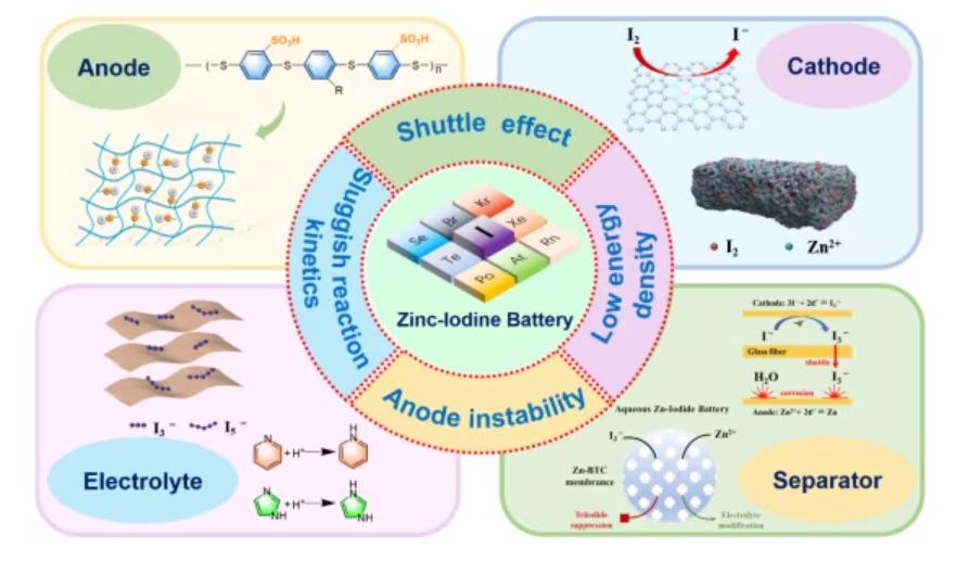 鑒于此,該團隊從鋅碘電池的基本原理出發,對鋅碘電池電化學和儲能機理進行了全面的綜述。該文章首先重點介紹了碘轉化和鋅陽極的電化學過程,指出了當前研發鋅碘電池面臨的一些挑戰,并綜述了近年來水系鋅碘電池的正極、負極、電解液、隔膜的研究進展。為加深對鋅碘電池的理解,文章對鋅碘電池的儲能、轉化機理進行了詳細的討論。最后,對鋅碘電池的設計與發展提出了合理的建議,對其商業化應用前景提出了展望。