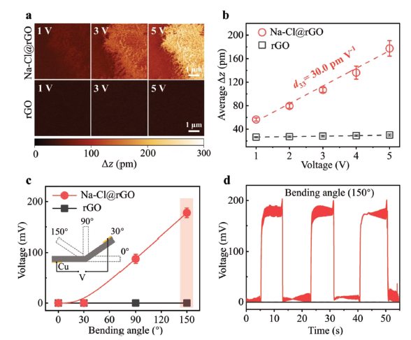該團隊設計了一種可將rGOM中Na2Cl含量提升一個數量級的方法,將rGOM附著在三電極配置的電化學工作站的工作電極上,通過在rGOM上施加負電勢,加強結晶過程中Na+-π相互作用。在-0.6V的電勢下,Na2Cl晶體增加了10倍以上。常規的rGOM不具備壓電特性,而含有Na2Cl晶體的rGOM則表現出優異的壓電性能。當該rGOM彎曲150°時,可獲取180mV的輸出電壓,為這種含有異常鹽晶體的二維材料在場效應晶體管、新型多鐵性材料等實際應用的實現提高了有力支撐。