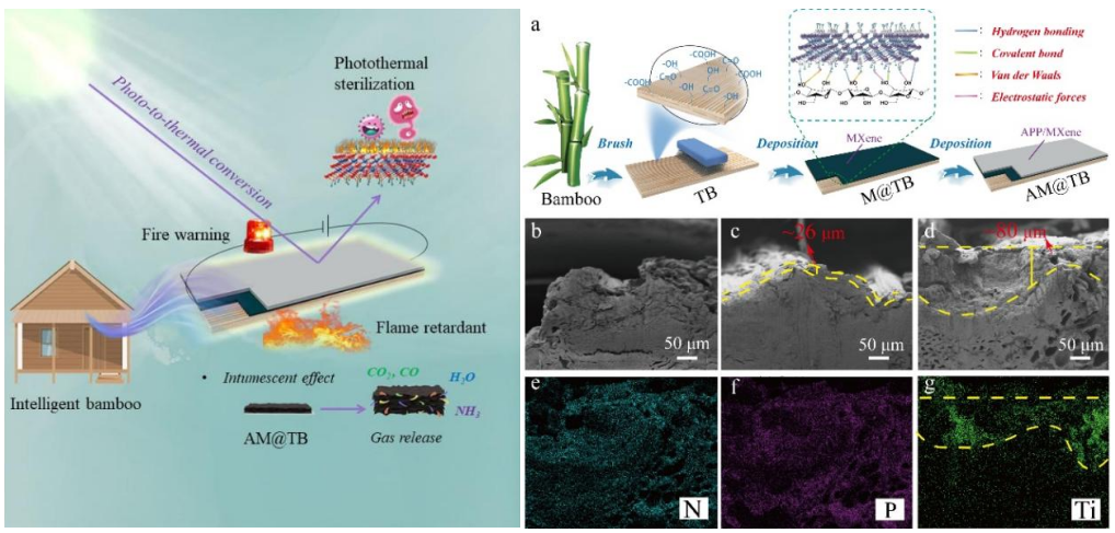 竹材及其制品是我國鄉村振興、碳達峰碳中和等重大戰略中備受推崇的特色產品,但其易燃、易霉等固有缺點阻礙了廣泛推廣應用,這是當前制約竹材工業高質量發表的一大技術瓶頸。為此,杜春貴團隊創建了一種低溫揮發誘導自組裝策略,通過充分發揮Ti3C2Tx(MXene)與預處理竹材(TB)之間的多重相互作用,在不使用膠粘劑的情況下,實現了具有防火、可重復預警與光熱殺菌等功能的智能竹材的制備。與普通竹材相比,智能竹材具有優異的阻燃性能:極限氧指數降低65.8%、熱釋放率降低80.3%、殘余物質量增加1.6倍;具有靈敏的火災響應和重復預警性:響應時間不超過2s,重復預警次數大于10次;具有出色的光熱轉換性能,在近紅外激光(NIRL)照射后表現出較好的殺菌效果。該項研究為設計和制造兼具阻燃、抗菌、火災預警預報等功能的生物質材料提供了靈感。