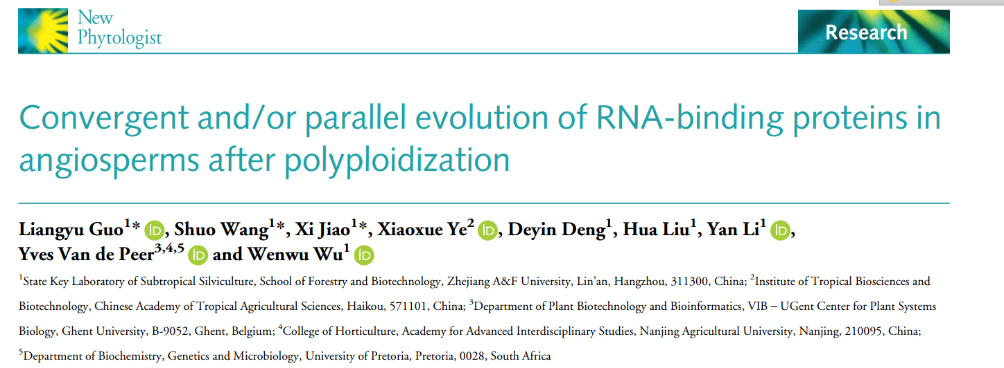 近日,浙江農林大學國家重點實驗室李彥、吳文武教授與比利時根特大學Yves Van de Peer院士聯合在《New Phytologist》(中國科學院1區Top,IF5-yr=10.5)上發表了題為“Convergent and/or parallel evolution of RNA-binding proteins in angiosperms after polyploidization”(被子植物多倍化后RNA結合蛋白的趨同或平行進化)的研究論文。該研究主要基于擬南芥、毛果楊、蘋果、番茄、大豆、山核桃、水稻、玉米、毛竹、棕櫚等21個代表性被子植物,結合基因組學、轉錄組學、調控組學以及古氣候學研究數據,揭示了在WGD后被子植物RBP基因趨同進化以適應K-Pg和晚新生代冰期的全球大降溫。
