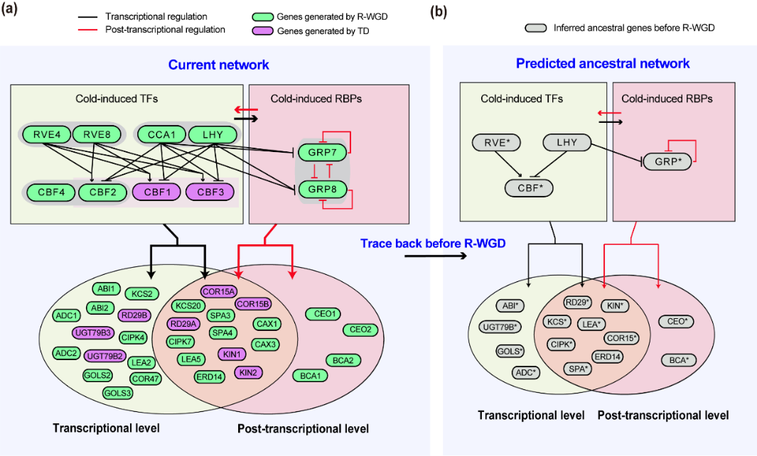 圖2.晝夜節律和低溫調控網絡在R-WGD后的重塑和升級模式圖