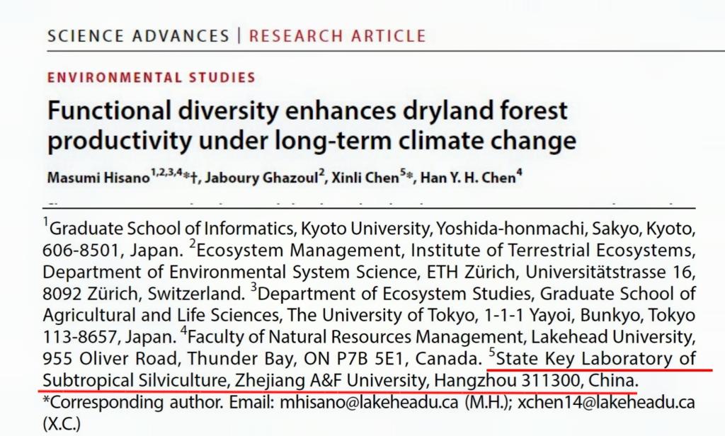 浙江農林大學為該論文共同通訊作者單位,陳信力教授和日本京都大學助理教授Masumi Hisano為該論文共同通訊作者。