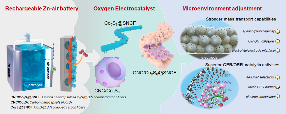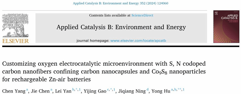 近日,化材學院胡勇教授與顏磊博士等人在國際頂級期刊《Applied Catalysis B: Environment and Energy》(中科院1區(qū)TOP,IF=22.1)發(fā)表題為《調(diào)控基于碳膠囊與Co9S8納米顆粒組成的S,N共摻雜碳纖維氧電催化劑的界面微環(huán)境用于高效鋅空電池》“Customizing oxygen electrocatalytic microenvironment with S, N codoped carbon nanofibers confining carbon nanocapsules and Co9S8nanoparticles for rechargeable Zn-air batteries”的研究論文。
