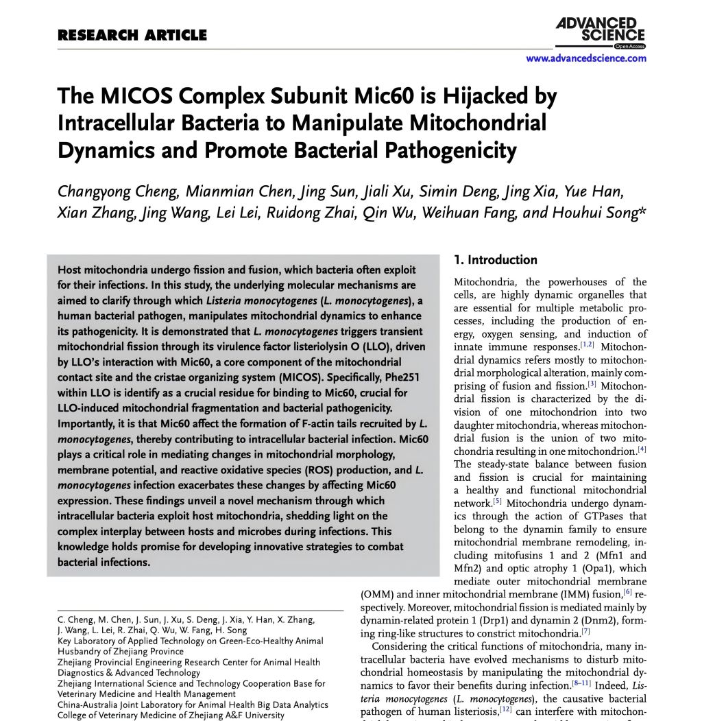 近日,動科動醫學院同一健康與交叉前沿學科研究團隊在國際權威期刊《Advanced Science》(中科院一區TOP期刊,IF5-year:16.3)發表了題為“The MICOS complex subunit Mic60 is hijacked by intracellular bacteria to manipulate mitochondrial dynamics and promote bacterial pathogenicity”(《胞內病原菌通過操縱宿主線粒體接觸位點和嵴組織系統(MICOS)亞基Mic60調控線粒體結構變化并介導細菌的致病性》)的最新研究論文。動科動醫學院程昌勇教授為論文第一作者,宋厚輝教授為論文通訊作者。該研究得到了國家重點研發計劃青年科學家項目、國家自然科學基金、浙江省自然科學基金等項目的支持。