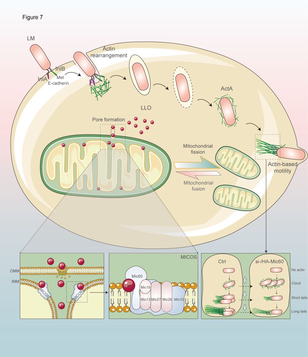 該研究聚焦重要人獸共患胞內病原菌——單增李斯特菌,系統探索了病原在感染過程中與宿主線粒體的調控關系,首次揭示了細菌重要毒力因子與線粒體接觸位點和嵴組織系統(MICOS)復合物的互作分子機制。
