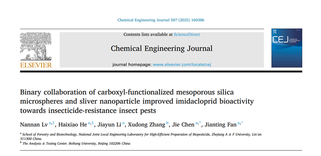 近日,林業與生物技術學院綠色農藥團隊在化學領域國際權威期刊《Chemical Engineering Journal》(化學工程雜志)(中科院1區TOP,五年影響因子:13.2)上發表了題為“Binary collaboration of carboxyl-functionalized mesoporous silica microspheres and sliver nanoparticle improved imidacloprid bioactivity towards insecticide-resistance insect pest”(《羧基功能化介孔二氧化硅納米微球與納米銀顆粒的二元協同作用提高吡蟲啉對抗性害蟲的生物活性》)的研究論文。青年教師呂楠楠和碩士研究生何海嘯為論文共同第一作者,樊建庭教授和陳杰教授為通訊作者。浙江農林大學林業與生物技術學院為該論文第一單位和通訊作者單位。