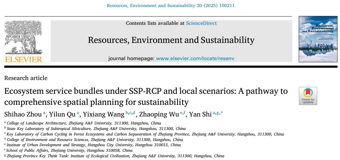 近日,風(fēng)景園林與建筑學(xué)院碩士研究生周世豪第一作者的文章《Ecosystem service bundles under SSP-RCP and local scenarios: A pathway to comprehensive spatial planning for sustainability》(《SSP-RCP和地方情景下的生態(tài)系統(tǒng)服務(wù)簇研究:邁向可持續(xù)綜合空間規(guī)劃的路徑》)發(fā)表在《Resources, Environment and Sustainability》。該期刊為中科院環(huán)境科學(xué)與生態(tài)學(xué)1區(qū)TOP期刊,JCRQ1區(qū),影響因子為12.4。風(fēng)景園林專(zhuān)業(yè)碩士生導(dǎo)師史琰副教授為通訊作者。