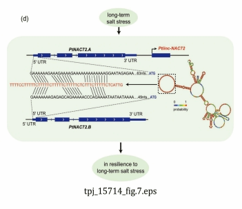 近年來(lái),發(fā)現(xiàn)越來(lái)越多的長(zhǎng)鏈非編碼RNA (lncRNA)參與調(diào)控多種生物分子過(guò)程。然而,關(guān)于它們?cè)邴}脅迫下對(duì)基因表達(dá)的順式和反式調(diào)節(jié)作用的了解仍較少。在本研究中,研究團(tuán)隊(duì)獲得以下初步結(jié)果:(1)使用來(lái)自毛果楊葉、莖和根的27個(gè)RNA-seq 數(shù)據(jù)集,確定了2988個(gè)高置信度 lncRNA,包括1183個(gè)受到鹽誘導(dǎo)表達(dá)。其中,301個(gè)lncRNA有可能主要通過(guò)順式調(diào)節(jié)方式(而不是共轉(zhuǎn)錄方式)正調(diào)控其相鄰基因。(2)共表達(dá)網(wǎng)絡(luò)分析篩選到六個(gè)突出的鹽響應(yīng)模塊,共有5,639個(gè)基因,包括426個(gè)lncRNA,并且這些lncRNA序列中富集了相當(dāng)數(shù)量的DNA/RNA結(jié)合基序。這表明lncRNA可能通過(guò)反式調(diào)節(jié)方式調(diào)控這些鹽響應(yīng)模塊中的遠(yuǎn)距離基因表達(dá)。(3)進(jìn)一步,篩選到30個(gè)lncRNA,可能同時(shí)順式和反式調(diào)節(jié)下游鹽響應(yīng)同源基因。其中,Ptlinc-NAC72,是在長(zhǎng)期鹽處理后,特異性劇烈上調(diào)表達(dá)。(4)瞬時(shí)轉(zhuǎn)化實(shí)驗(yàn)表明Ptlinc-NAC72可以直接上調(diào)同源基因PtNAC72.A和PtNAC72.B (PtNAC72.A/B)的表達(dá)。進(jìn)一步實(shí)驗(yàn)證明,該調(diào)節(jié)作用可能是由Ptlinc-NAC72識(shí)別PtNAC72.A/B 5' UTR中的串聯(lián)元件 (GAAAAA) 介導(dǎo)的。(5)在功能上,過(guò)表達(dá)Ptlinc-NAC72植株表現(xiàn)出了過(guò)敏表型。可見(jiàn),Ptlinc-NAC72負(fù)調(diào)控鹽脅迫過(guò)程,結(jié)合Ptlinc-NAC72在鹽脅迫后期表達(dá)的特性,推斷Ptlinc-NAC72在植株適應(yīng)鹽脅迫后,促進(jìn)植株恢復(fù)生長(zhǎng)。